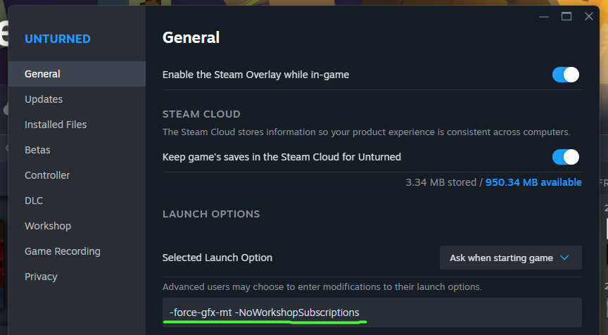 -force-gfx-mt: Uses Unity’s multithreaded rendering pipeline-NoWorkshopSubscriptions: Prevents asset conflicts from subscribed workshop mods